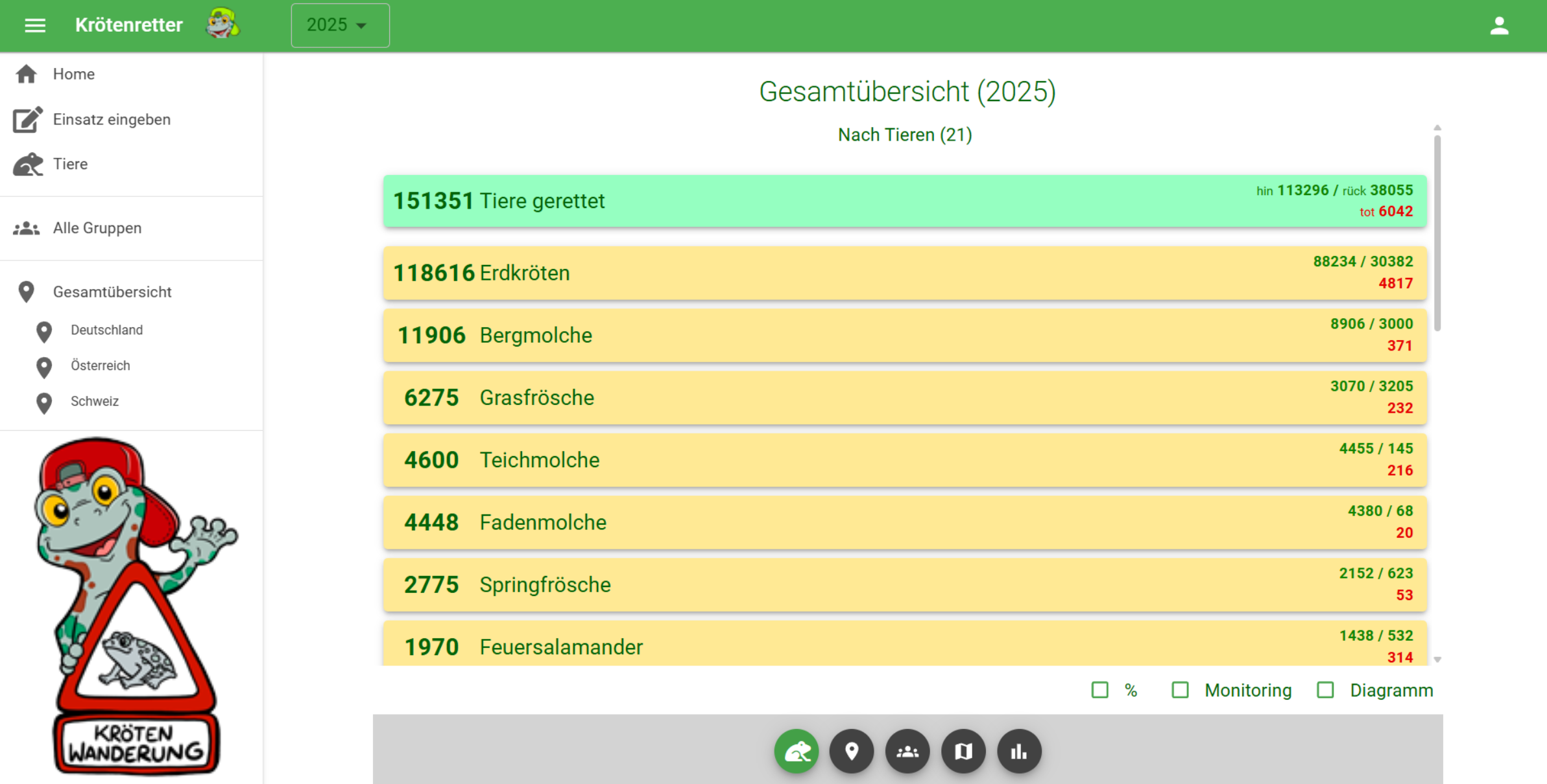 Mit der neuen "Krötenretter"-App steht ab dieser Wandersaison eine digitale Möglichkeit zur Verfügung, Daten zur Amphibienwanderung einfach und schnell zu erfassen. Über die App bzw. Webseite können Funde direkt eingegeben werden. Die Daten werden live in eine zentrale Datenbank übertragen und sind öffentlich einsehbar. Auch Auswertungen in Zahlen und Diagrammen sowie eine Einsatzplanung sind möglich.