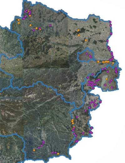 * Abbildung 1: Verbreitungskarte der besuchten Gewässer ohne zum Zeitpunkt der Kartierung ausgeprägten Zwergbinsenfluren (in Orange) und besuchten Gewässer mit zum Zeitpunkt der Kartierung ausgeprägten Zwergbinsenfluren (in Lila).