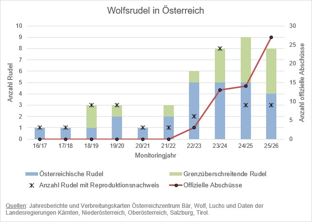 Ob einige Rudel – insbesondere in Kärnten – noch existieren, ist unklar. Die Daten basieren teils auf Nachweisen von Anfang 2025 und damit auf dem vorherigen Monitoringjahr. Verlässliche Aussagen zur aktuellen Situation sind daher nur eingeschränkt möglich. Seit 2018 haben sich zudem fünf Rudel wieder aufgelöst – Ursachen unbekannt. Dabei sind stabile Rudel die Grundlage jeder Population. Tatsächlich konnten sich bislang nur wenige Rudel in Österreich über mehrere Jahre halten. Der Großteil der 2025 genetisch nachgewiesenen rund 120 Wölfe waren hingegen Durchzügler, die bisher keinen Beitrag zum Bestandsaufbau leisten konnten.