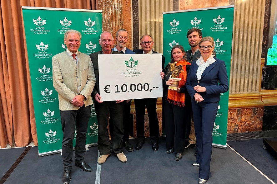 Das langjährige Engagement und die breite Trägerschaft des Projekts beeindruckten die Jury und der Verein Grünes Kreuz zeichnete das Projekt „Wiesenbrüterschutz in Vorarlberg am 27. November 2025 im Rahmen eines feierlichen Festaktes im österreichischen Parlament mit dem Biodiversitätspreis 2025 aus. Dr. Christa Kummer, Präsidentin des Vereins Grünes Kreuz, überreichte den Preis an Günther Ladstätter, 2. Obmann des Naturschutzbundes Vorarlberg, Landesjägermeister Dr. Christoph Breier, Bianca Burtscher, Geschäftsführerin des Naturschutzbundes Vorarlberg, Gernot Heigl, Geschäftsführer der Vorarlberger Jägerschaft und Reinhard Hellmair, jagdlicher Projektkoordinator. Das Preisgeld in Höhe von 10.000 Euro wird zweckgebunden für weitere biodiversitätsfördernde Maßnahmen eingesetzt.